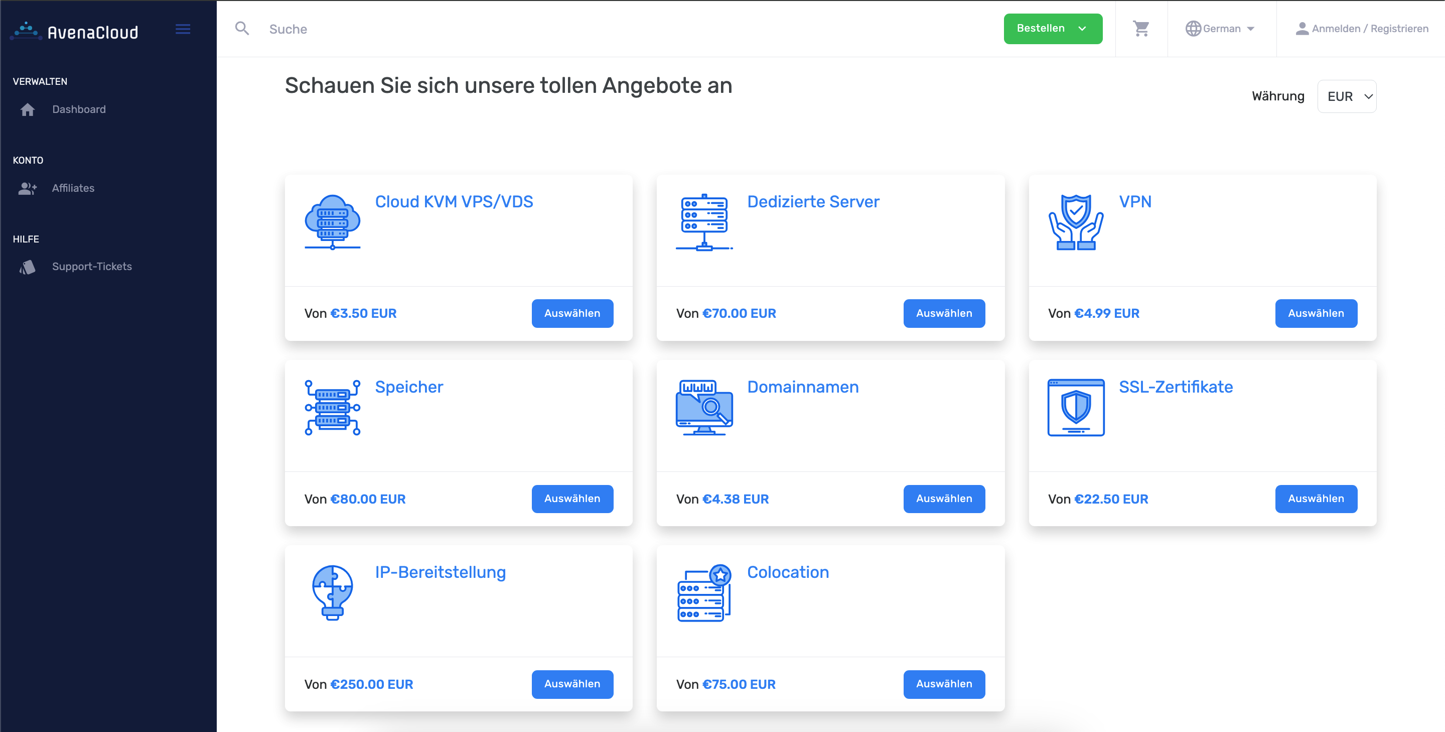 AvenaCloud bietet ein modernes und benutzerfreundliches Dashboard, um die Wartung und Konfiguration Ihres Hosting-Dienstes zu erleichtern.